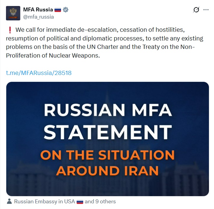 রাশিয়া অবিলম্বে এই সংঘাত বন্ধ করার আর্জি জানিয়েছে এবং আলোচনা ও কূটনৈতিক পথে সমস্যা সমাধানের অনুরোধ করেছে। রাশিয়ার বিদেশ মন্ত্রক সোশাল মিডিয়ায় এই মর্মে পোস্ট করেছে, "জাতিসংঘের সনদ এবং পারমাণবিক অস্ত্র বিস্তার রোধ চুক্তির ভিত্তিতে বিদ্যমান যেকোনো সমস্যা সমাধানের জন্য আমরা অবিলম্বে উত্তেজনা হ্রাস, শত্রুতা বন্ধ, রাজনৈতিক ও কূটনৈতিক প্রক্রিয়া পুনরায় শুরু করার আহ্বান জানাচ্ছি ।"